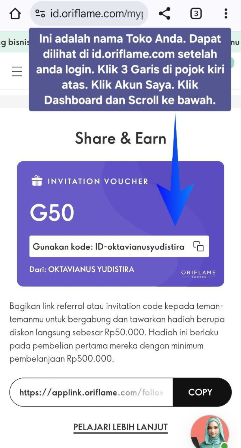 Nama Toko Anda bisa dicek setelah anda login di id.oriflame.com.